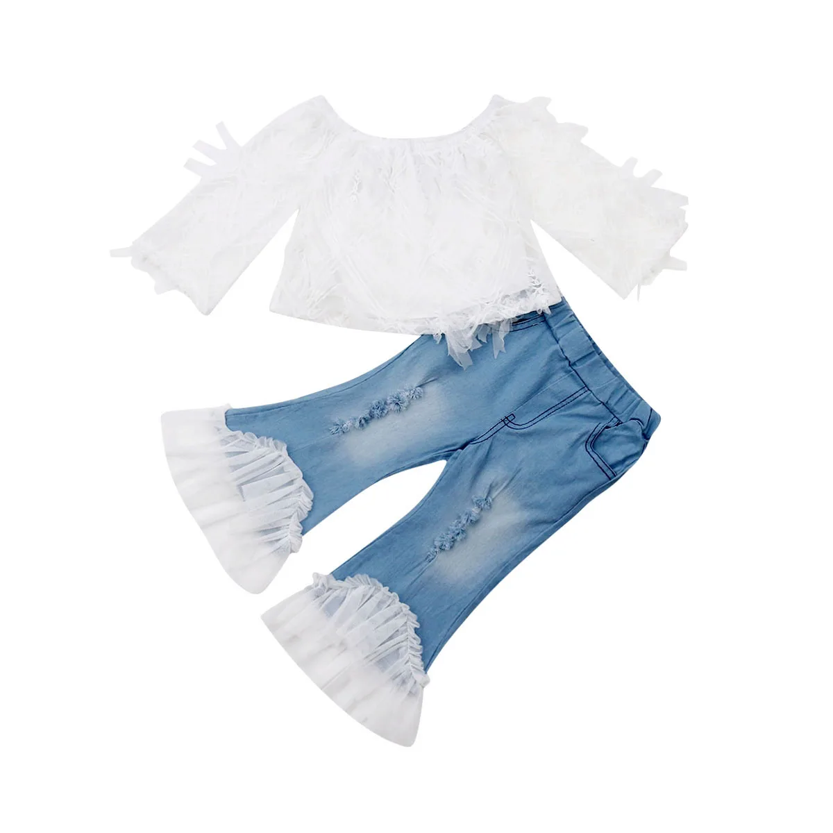Buy 1-6T Baby Girl 2Pcs Ripped Jeans Outfit Solid Lace Tulle Long Sleeve Off-Shoulder Crop Top Bell Bot Right Here and Right Now Just for USD US $6.13, Price will be rise up at any time without notification and I cant guaranted that the stock is still available tommorow or next hour. So Please Save It Now!