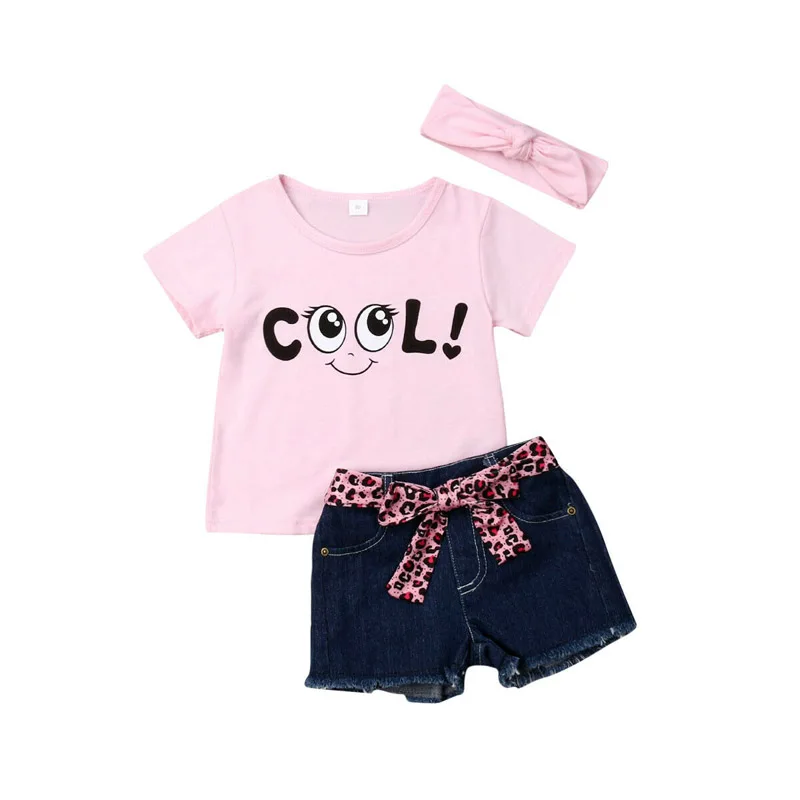 Best Offer of 3pcs Toddler Infant Baby Girl Cute Pink Printed Short Sleeve Tops+Leopard Bow Short Jeans + Headban